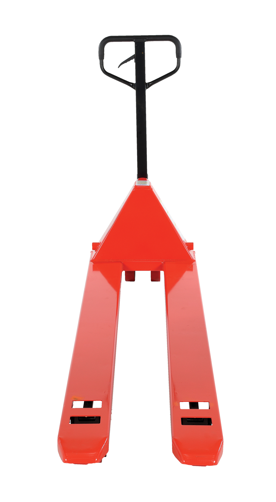 Steel Low Profile Pallet Truck 88 In. x 20-5/8 In. x 48 In. 4400 Lb. Capacity RedAn economical way for one person to move heavy pallet loads without the use of a fork truck! Includes two articulating steering wheels and two front load rollers. Ergonomic design requires only 75 pounds of pulling force when fully loaded. Steering wheels include bearing dust covers for added life. Nose wheels are located on the front edge of each fork to assist in clean pallet entrance and exit. Reinforced triple-formed steel forks provide twice the strength of standard single-formed forks. Equipped with internally mounted solid steel adjustable push rods. Spring loaded handle automatically returns to vertical position when not in use. Hydraulic pump design facilitates easy-access seal replacement. Chrome-plated hydraulic pump piston for long seal life.