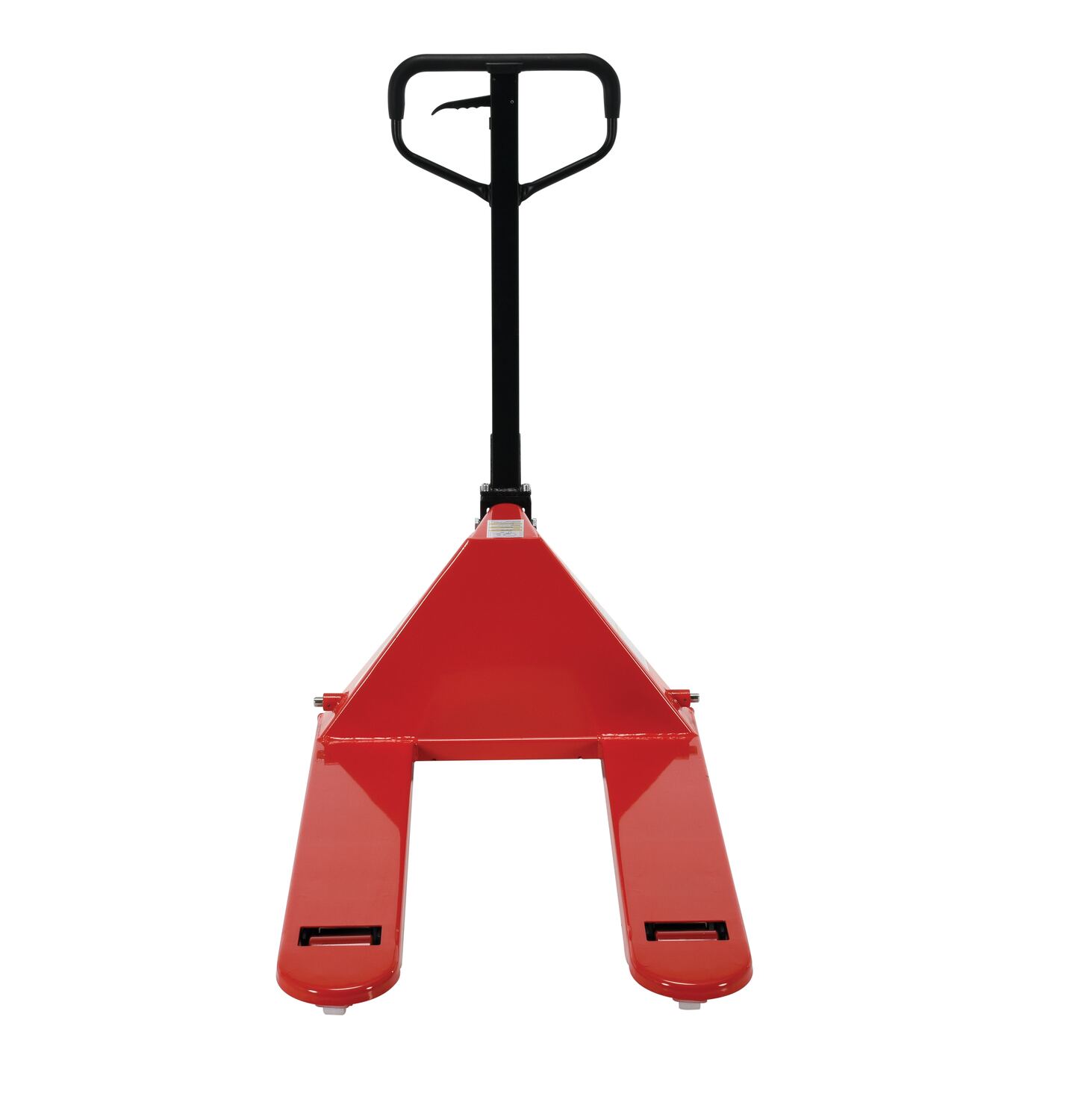Steel Full Featured Pallet Truck 49-1/2 In. x 27 In. x 48-1/2 In. 5500 Lb. Capacity RedAn economical way for one person to move heavy pallet loads without the use of a fork truck! Includes two articulating steering wheels and two front load rollers. Ergonomic design requires only 75 pounds of pulling force when fully loaded. Steering wheels include bearing dust covers for added life. Nose wheels are located on the front edge of each fork to assist in clean pallet entrance and exit. Reinforced triple-formed steel forks provide twice the strength of standard single-formed forks. Equipped with internally mounted solid steel adjustable push rods. Spring loaded handle automatically returns to vertical position when not in use. Hydraulic pump design facilitates easy-access seal replacement. Chrome-plated hydraulic pump piston for long seal life.