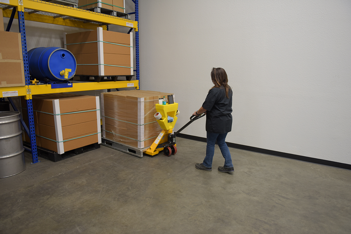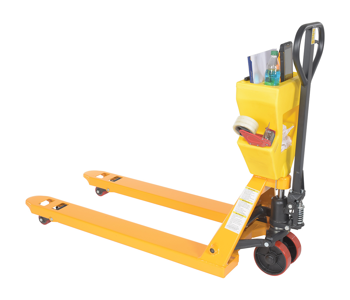 A pallet truck with a storage caddy is the perfect bundle of two innovative products. The pallet truck has an ergonomically friendly design with a limited pulling force required, while the caddy allows the user to be more organized and efficient. With a strong powder coated steel construction, the pallet truck moves easily between areas. Nose wheels are located on the front edge of each fork to assist in clean pallet entrance and exit. A molded plastic design allows the caddy to be durable throughout consistent daily use. Installation hardware and instructions included.