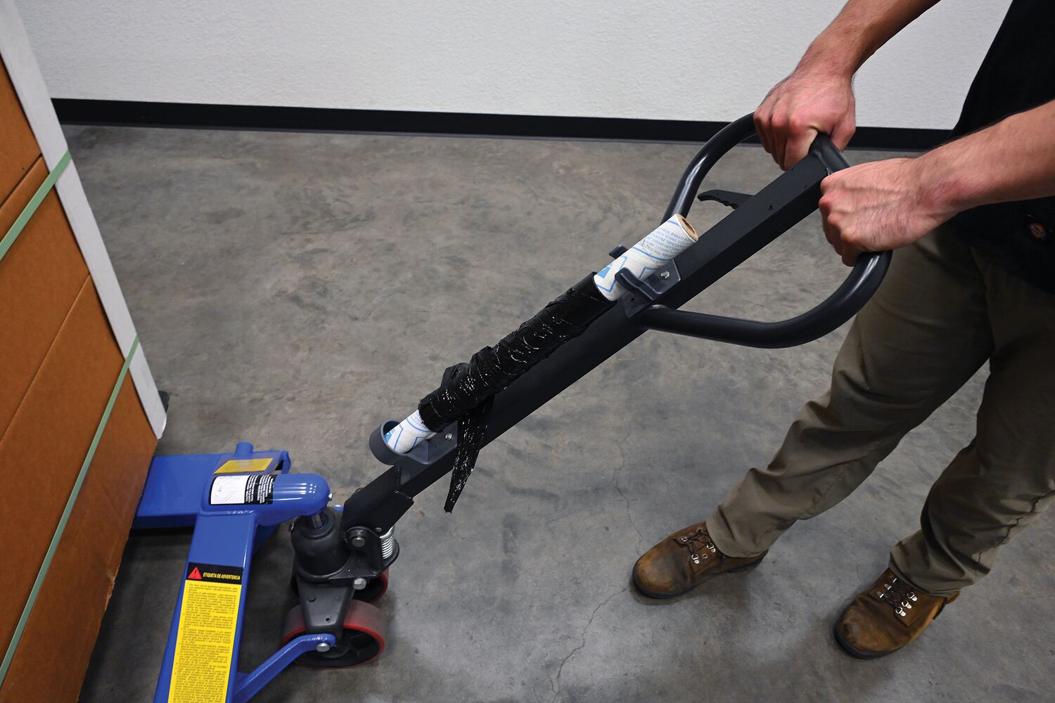 In warehouses stretch wrap is seemingly always required. But, rolls of wrap can often be elusive; gone the second you need it. That's where the stretch wrap caddy comes in! The stretch wrap caddy is built to hold rolls of wrap when your hands are otherwise in use, like driving a pallet truck. The caddy can be attached to the exterior of the pallet truck in any position that fits the users preference and ready for use in a matter of minutes. So stop wasting precious time looking for the roll of stretch wrap and just remember it's in the last place you left it; in the stretch wrap caddy!