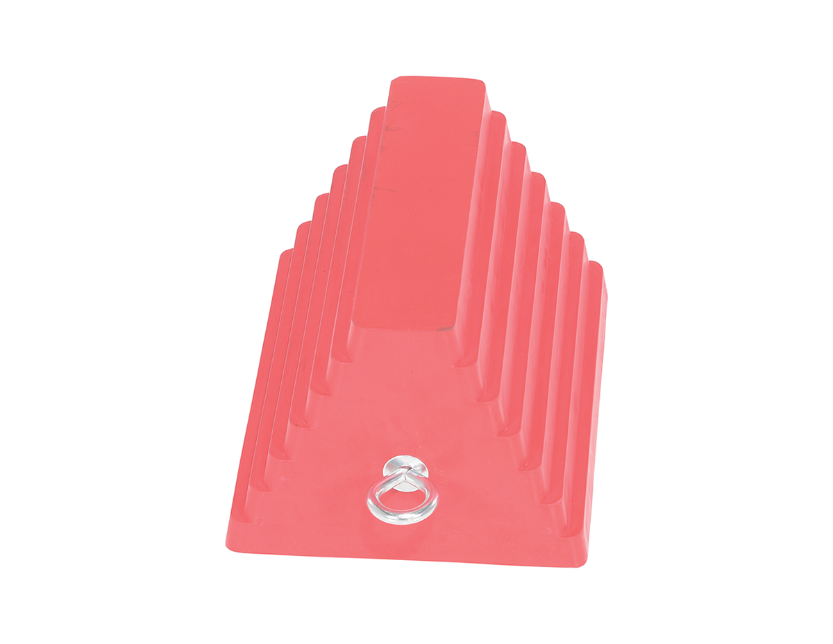 Rubber Wheel Chock with Eye Bolt 9 In. RedA rubber wheel chock is perfect for on the road or in the shop. The tiered rubber design enables the chock to hold more surface area, providing a secure tire position. With a compact, lightweight construction the chock is simple to handle and takes up minimal storage space. Eye bolt is included, giving the user the ability to add additional security to the chock.