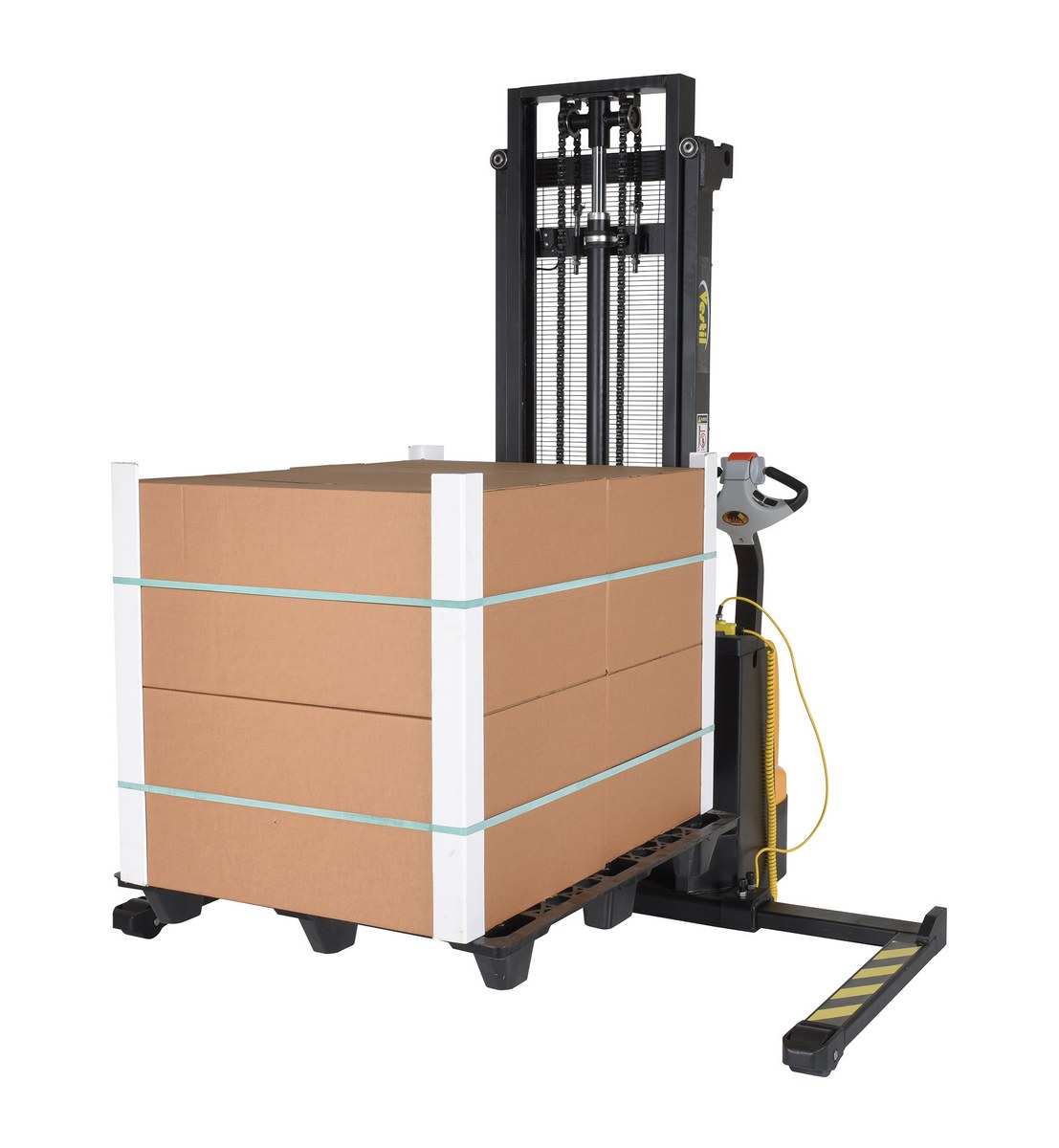 Double mast fully powered electric stacker transports loads throughout warehouse facilities quickly and with less effort. High torque drive and lift motor handles heavy-duty jobs. Ergonomic handle features easy-to-operate throttle with infinite adjustment of forward and reverse speeds, lift/lower controls, proprietary safety-enhancing emergency reverse function, and horn. Includes an electromagnetic disc brake with automatic dead-man feature that activates when user releases the handle. Powered lifter has two lead acid deep cycle batteries, integral battery charger, and battery level gauge. Stacker rolls smoothly on poly-on-steel steer and load wheels. 3-4 hour operation at full charge - 8 hours when used intermittently.