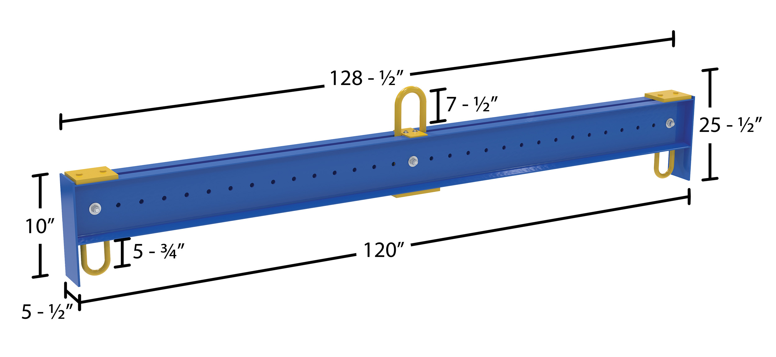 Steel Adjustable Spreader Beam 128-1/2 In Length 10,000 Lb. Capacity BlueAn adjustable spreader beam lifts uneven loads, all while keeping them level. Includes one upper bail and two specialty designed bail/sling holders. Bails are adjustable in 4" increments. The bails slide between two C-channels. Meets ASME B30.20-1993 standard. Baked-in powder coated toughness. Polyester lifting slings sold separately.