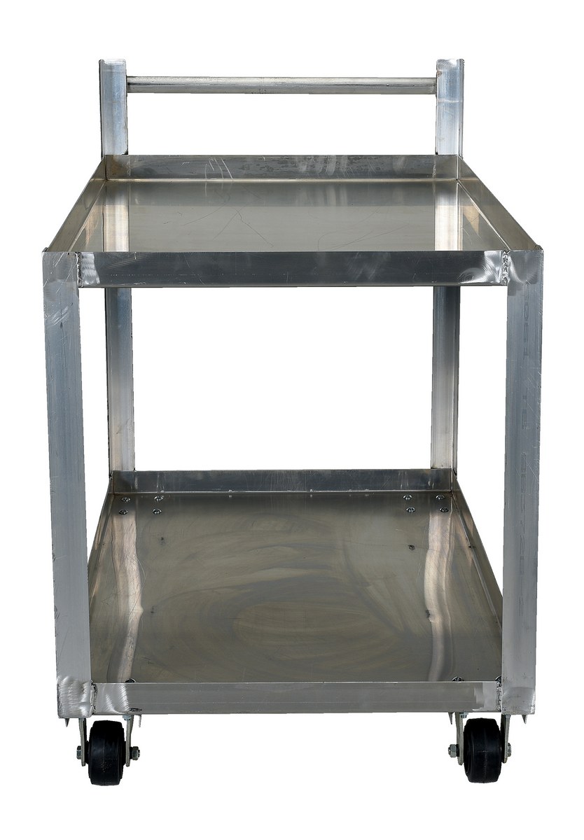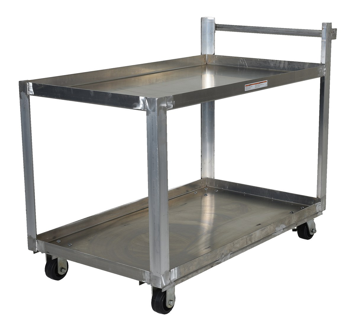 All welded service cart, made of aluminum is ideal for transporting parts and boxes. This unit has two (2) shelves, a lip is turned up on all shelves to prevent items from sliding off.