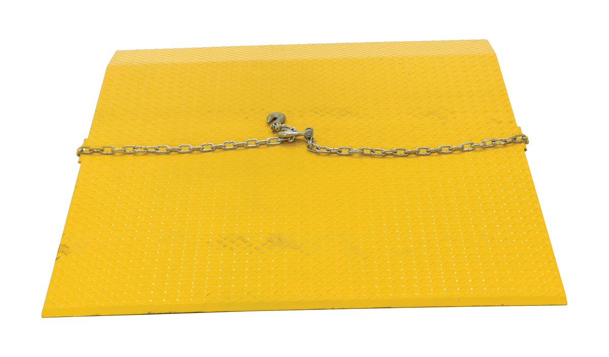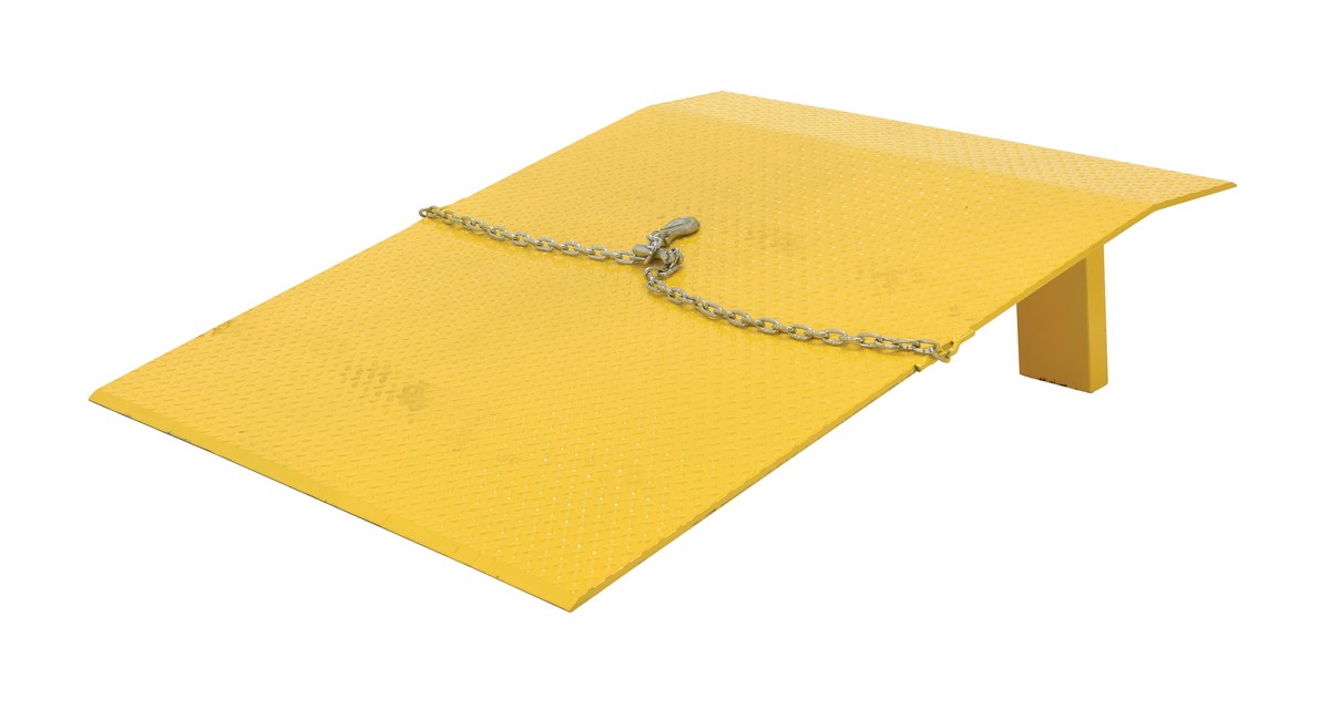 The steel truck dock plate is constructed of high strength INX-55 (55,000 psi) steel. Safety locking legs prevent slippage between truck and dock. Safety tread plate helps provide positive traction. Beveled edges for smooth entry and exit. Chain pickup comes standard. Designed with an 11 degrees bend located 9" from the beveled edge. The legs are 10" from the beveled edge. Manufactured in compliance with OSHA. When using three wheeled pallet trucks, select capacity +20% due to concentrated load center of board.