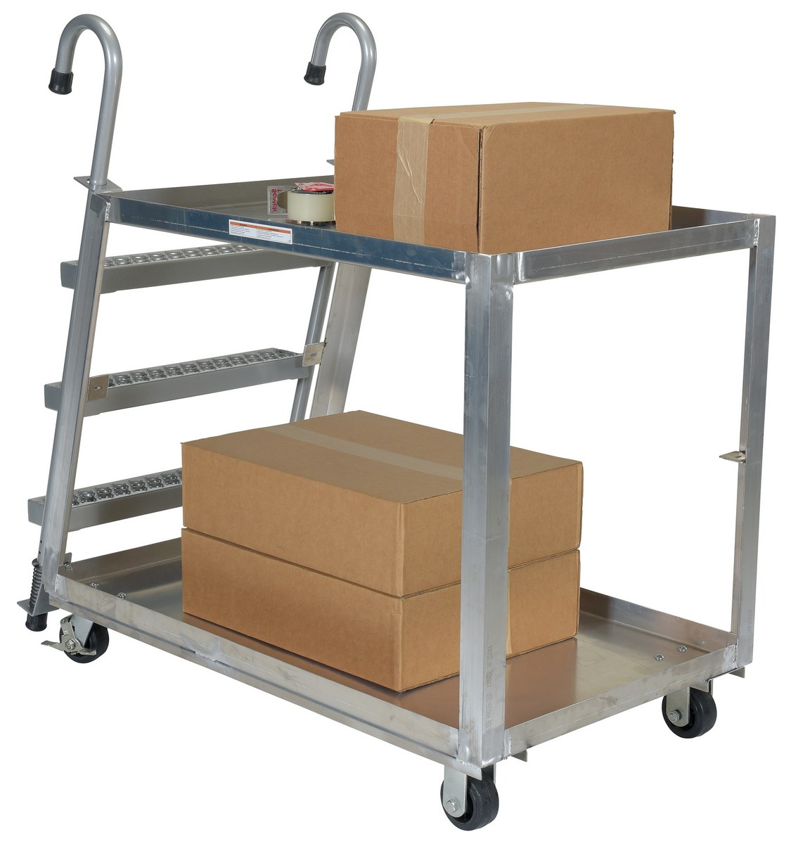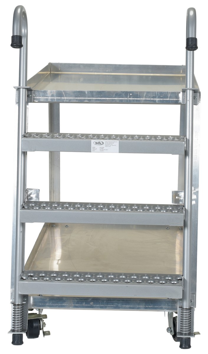 Combine the mobility of a cart with the versatility of a step ladder with this stock picker truck. Convenient spring loaded steel step ladder holds the cart securely in place while a person is standing on the ladder. Crutch tip ladder prevents the cart from moving while stocking. Springs then return the ladder to the raised position once personnel exit the step. All shelves have the lip turned up to prevent items from falling off. Ladders have a baked in silver powder coated finish.
