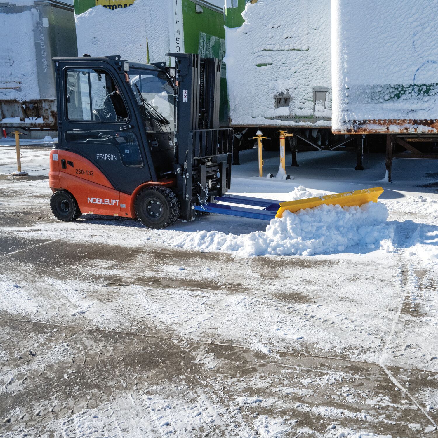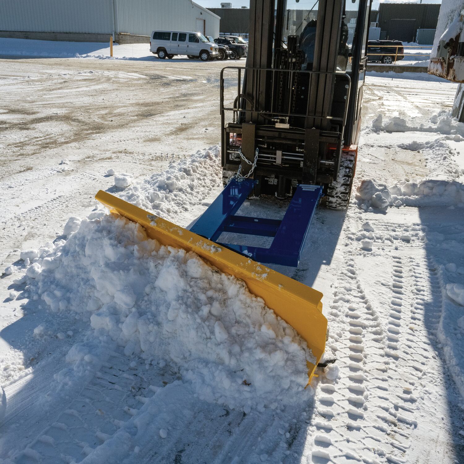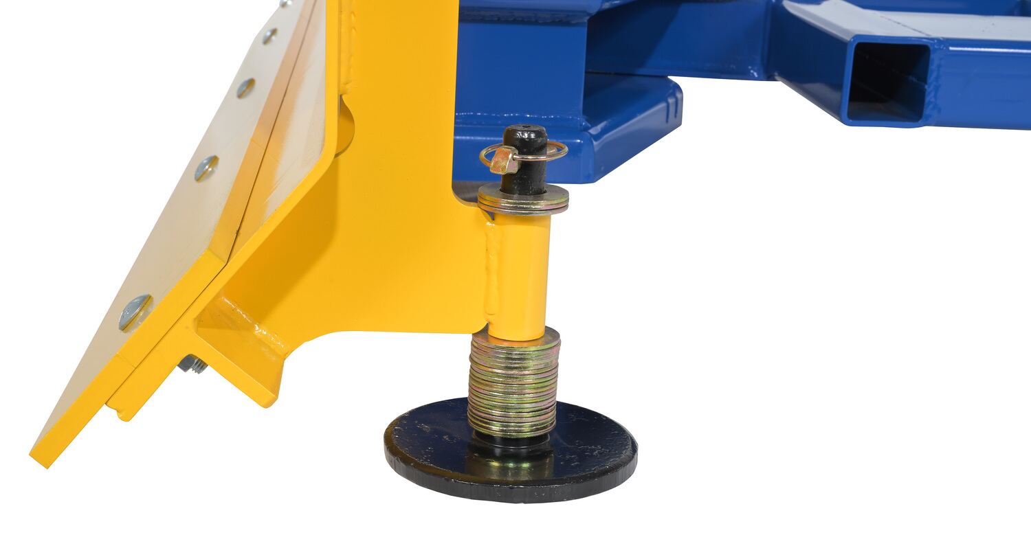 When snow needs moved and removed, look no further than the fork truck snow plow. The unique design attaches to fork truck forks, so no power supply is needed! The design of the plow keeps the weight to the back of the unit, towards fork truck mast. Manual pivot mechanism for angled plowing on both sides. Steel construction with baked in powder coat finish for added toughness.