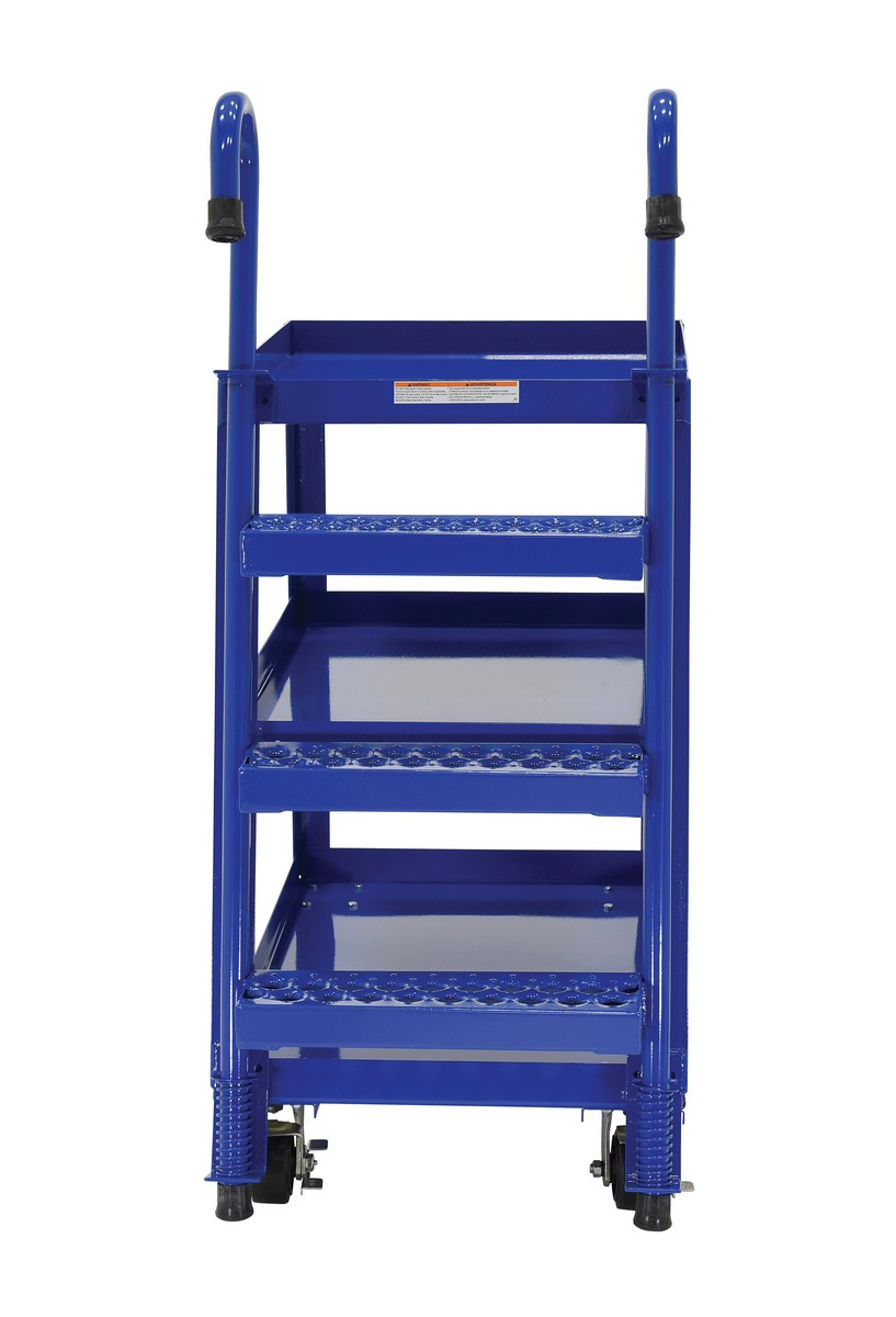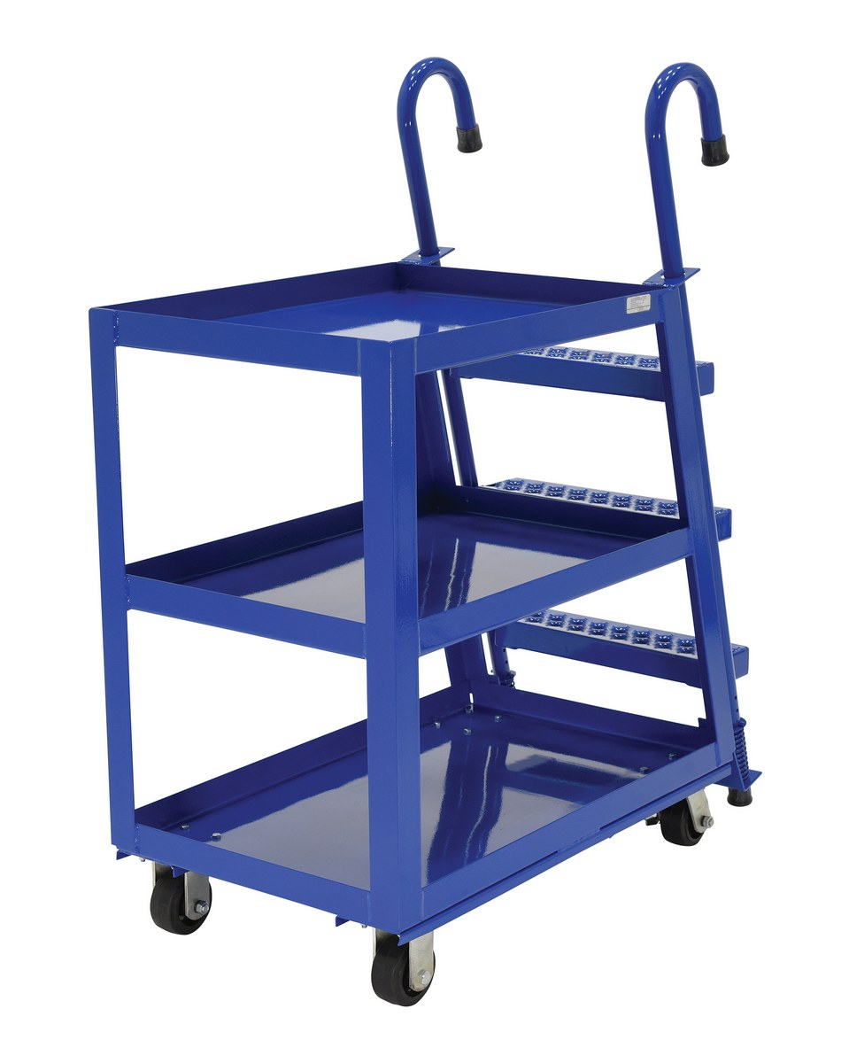 Steel Stock Picker 3 Shelf with Mold On Rubber Casters 39-3/4 In. x 21-7/8 In. x 50-1/8 In. 1,000 Lb. Capacity BlueCombine the mobility of a cart with the versatility of a step ladder with this stock picker truck. Convenient spring loaded steel step ladder holds the cart securely in place while a person is standing on the ladder. Crutch tip ladder prevents the cart from moving while stocking. Springs then return the ladder to the raised position once personnel exit the step. All shelves have the lip turned up to prevent items from falling off.