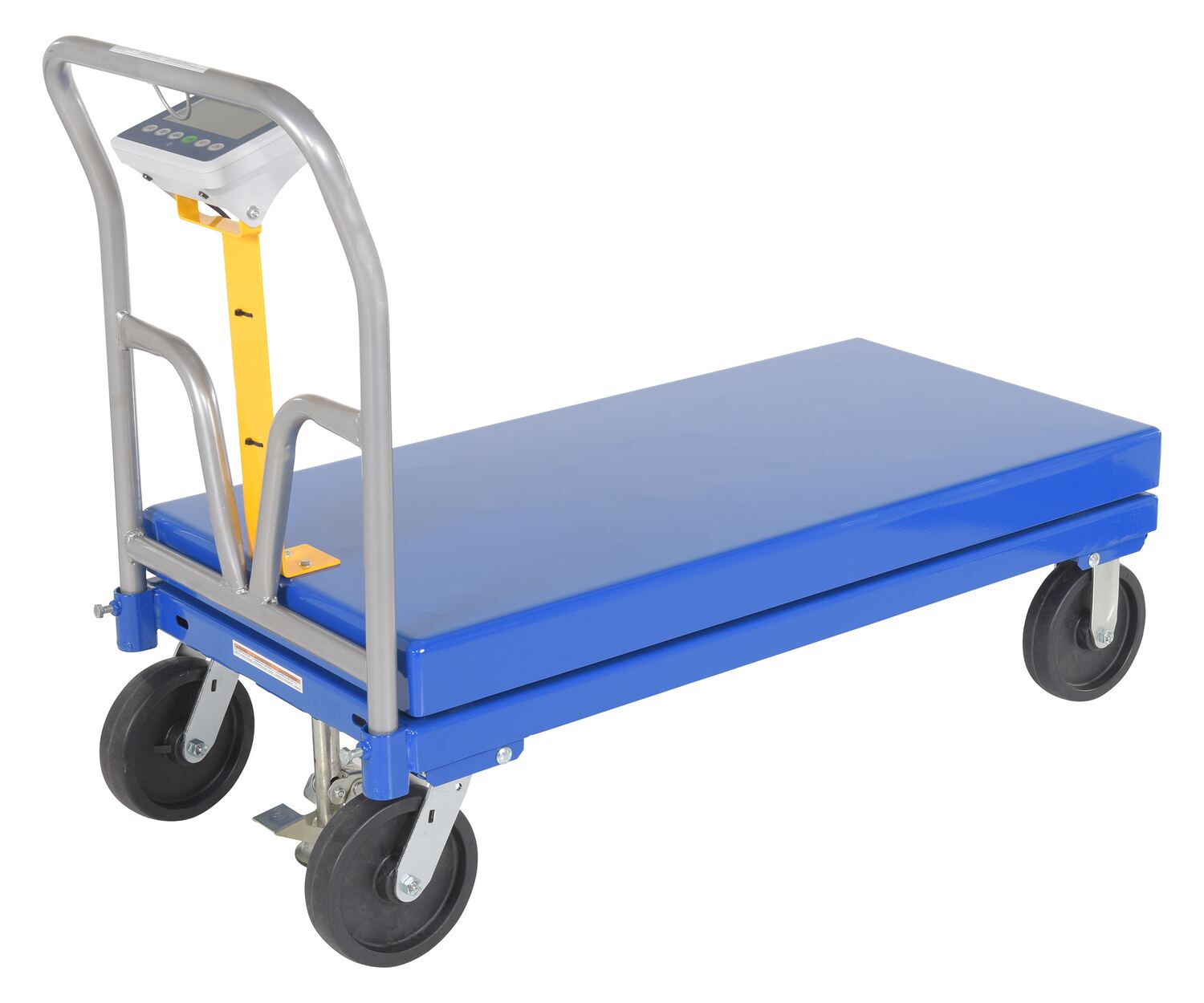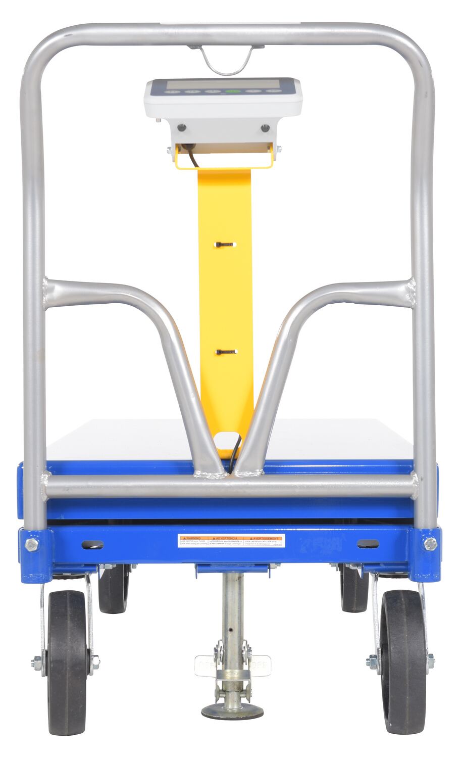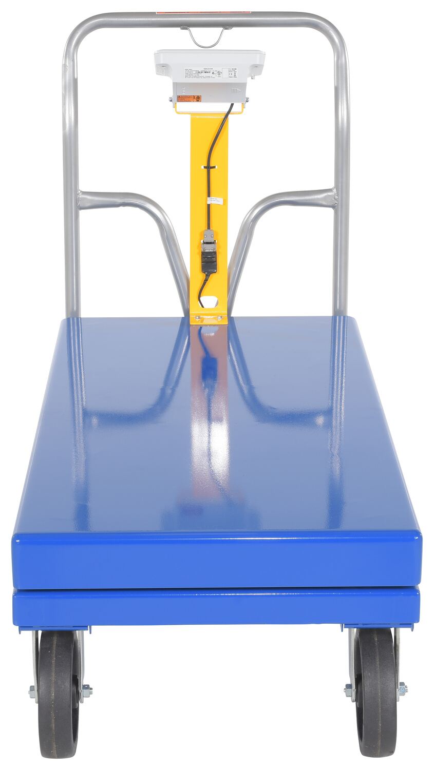This steel Platform Truck with solid, smooth deck, features structural reinforcement underneath for extra strength. Includes one (1) removable high-polished steel handle and a functional scale. The scale gives users the ability to weigh items during picking rather than in congested designated shipping areas. The readout screen sits atop a built in pedestal, centrally located under the handle. Durable blue powder coat finish.