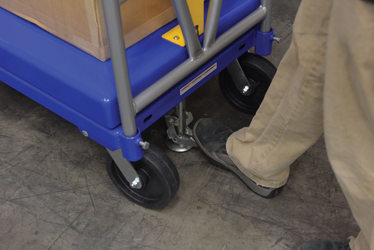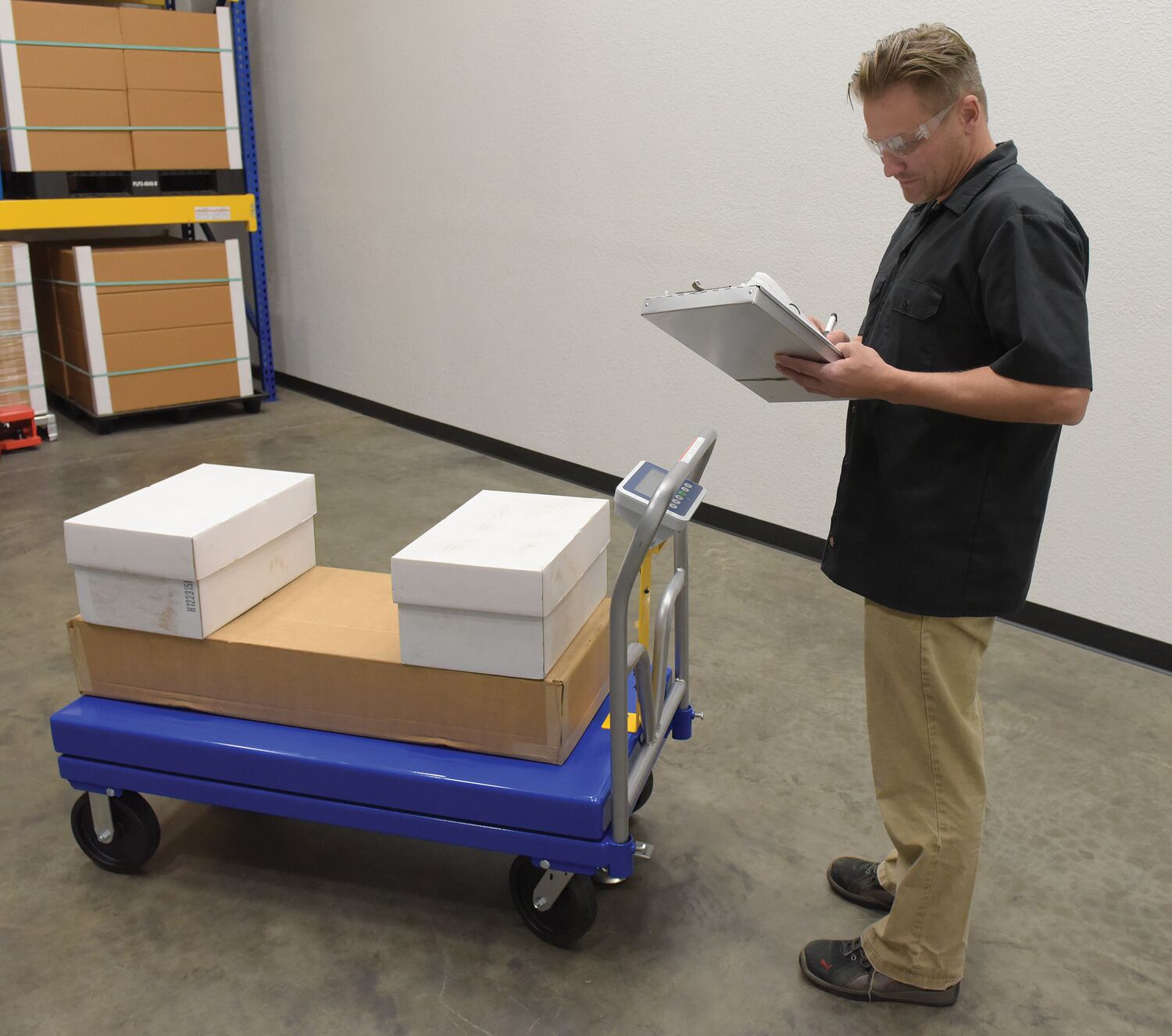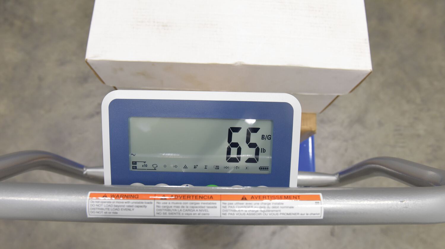 This steel Platform Truck with solid, smooth deck, features structural reinforcement underneath for extra strength. Includes one (1) removable high-polished steel handle and a functional scale. The scale gives users the ability to weigh items during picking rather than in congested designated shipping areas. The readout screen sits atop a built in pedestal, centrally located under the handle. Durable blue powder coat finish.