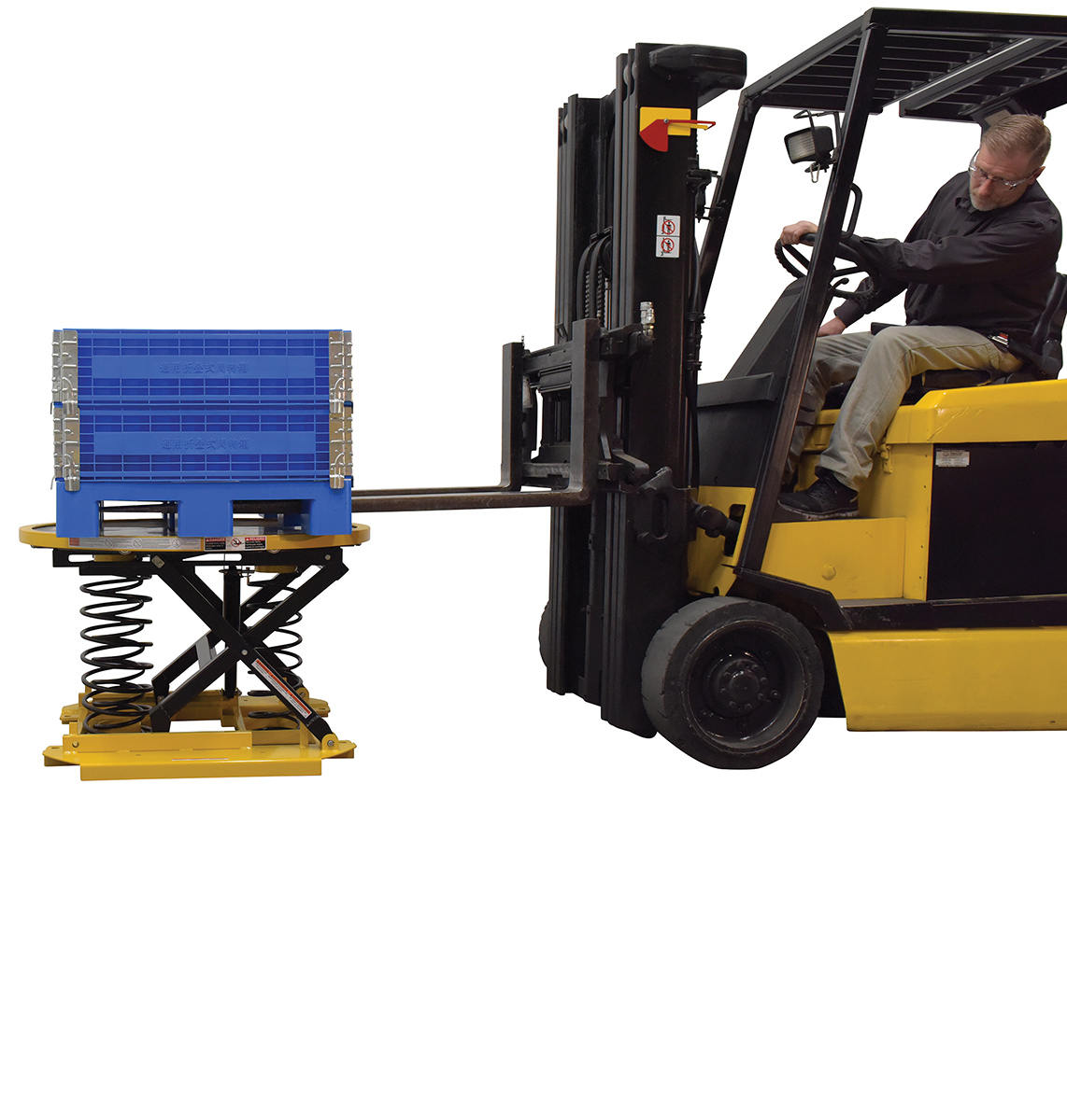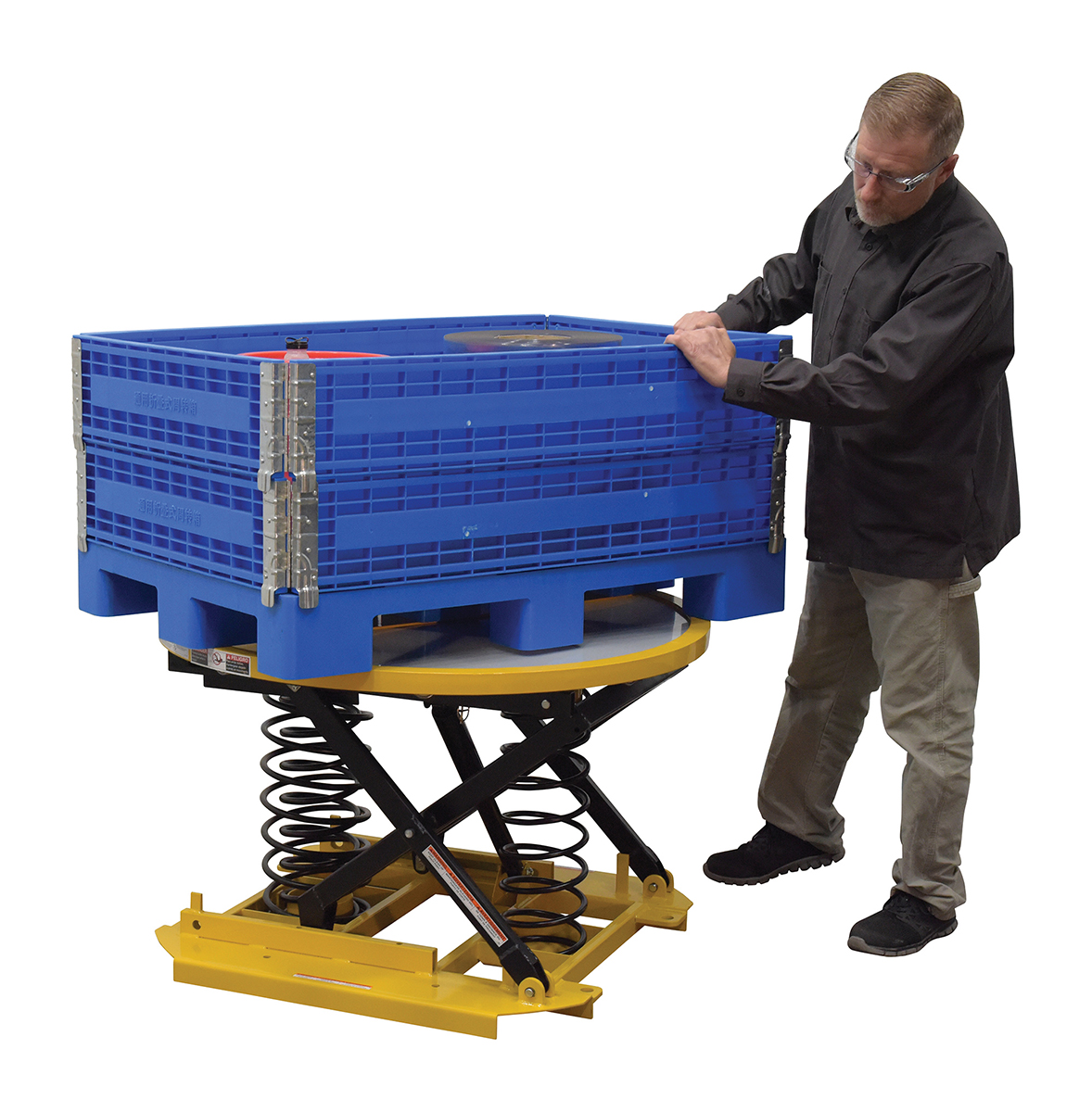 The spring scissor table is ideal for distributing and shipping facilities. The unit allows the user to transfer products from work space to work space, while holding an ergonomically friendly position. The frame is designed of a steel construction, which allows for strength and durability. The scissor mechanism raises the unit to the desired height, while the internal spring provides support when unit is being loaded and unloaded. The round top manually rotated for improved packaging and handling capabilities.