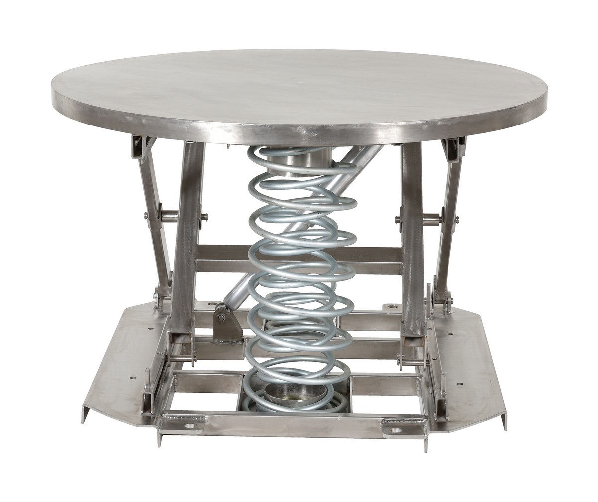 The spring scissor table is ideal for distributing and shipping facilities. The unit allows the user to transfer products from work space to work space, while holding an ergonomically friendly position. The frame is designed of a stainless steel construction, which allows for strength, durability, and a long lifespan. The scissor mechanism raises the unit to the desired height, while the internal spring provides support when unit is being loaded and unloaded. The round top can be manually rotated 360 degrees for improved packaging and handling capabilities.