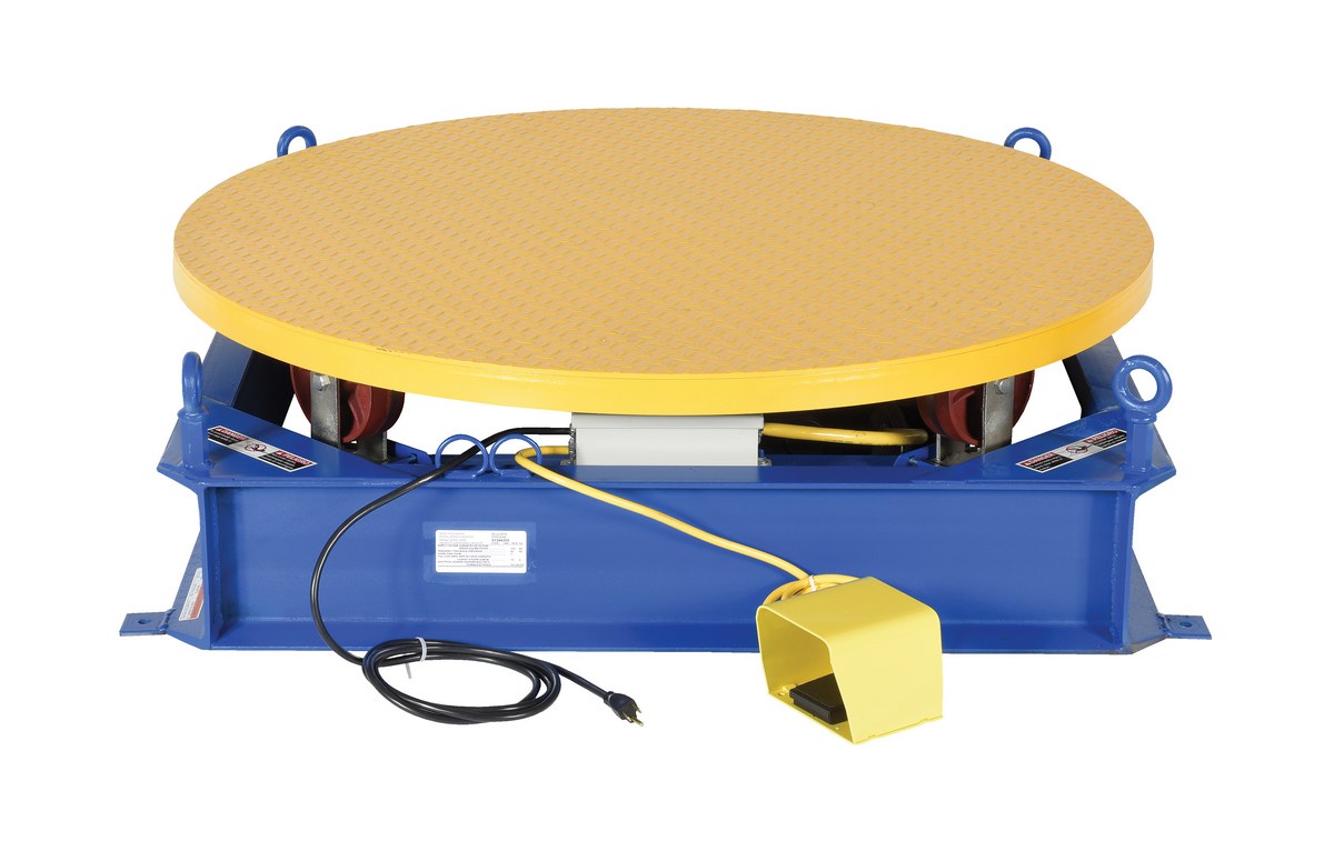 The stand alone powered carousel easily rotates pallets, skids, and other large objects with this rugged powered carousel. This carousel includes a round tread plate turntable that is supported with inverted casters for use as bearings. Also included; turntable, base, power unit, and fixed-speed control. Unit has a heavy-duty steel construction.