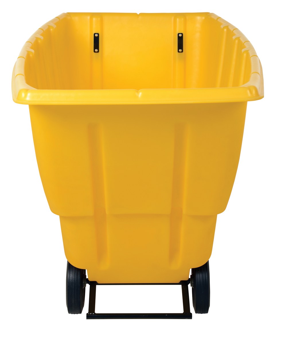 Durable plastic construction allows for collecting waste from multiple bins at a collective time. Great for warehouses, fairs, ball parks, schools, etc. Strong, one-piece molded polyethylene body with steel base tip support and a balanced design to allow for simple dumping by one person. Easily portable on 2 large rubber wheels and two swivel wheels. Not for use with fork trucks. Yellow color design.