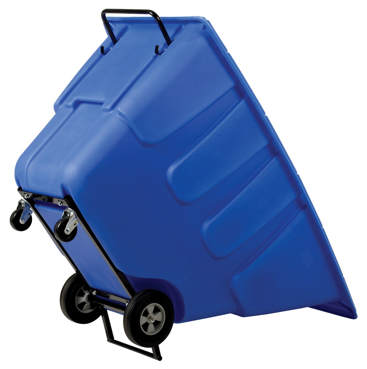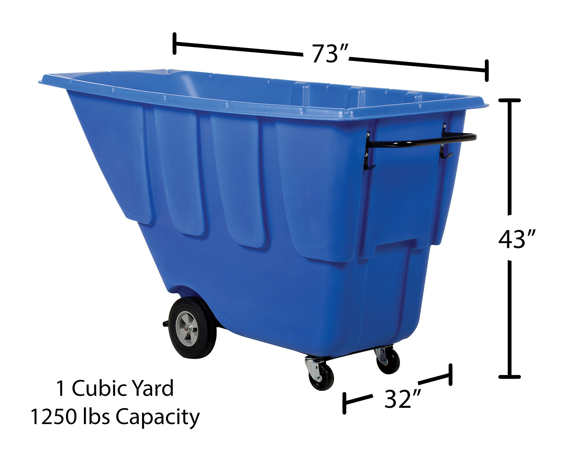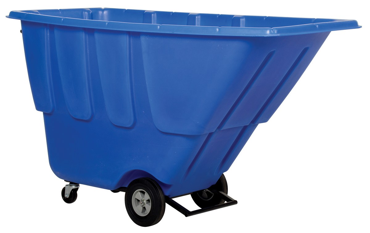 Plastic Medium Duty Tilt Truck 1 Cubic Yard 1250 Lb. Capacity BlueDurable plastic construction allows for collecting waste from multiple bins at a collective time. Great for warehouses, fairs, ball parks, schools, etc. Strong, one-piece molded polyethylene body with steel base tip support and a balanced design to allow for simple dumping by one person. Easily portable on 2 large rubber wheels and two swivel wheels. Not for use with fork trucks. Blue color design.