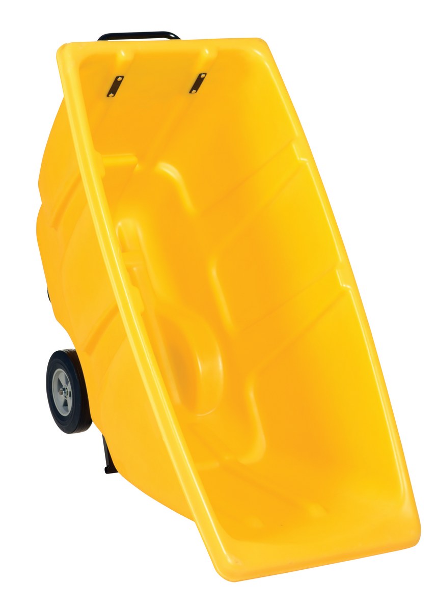 Durable plastic construction allows for collecting waste from multiple bins at a collective time. Great for warehouses, fairs, ball parks, schools, etc. Strong, one-piece molded polyethylene body with steel base tip support and a balanced design to allow for simple dumping by one person. Easily portable on 2 large rubber wheels and two swivel wheels. Not for use with fork trucks. Yellow color design.
