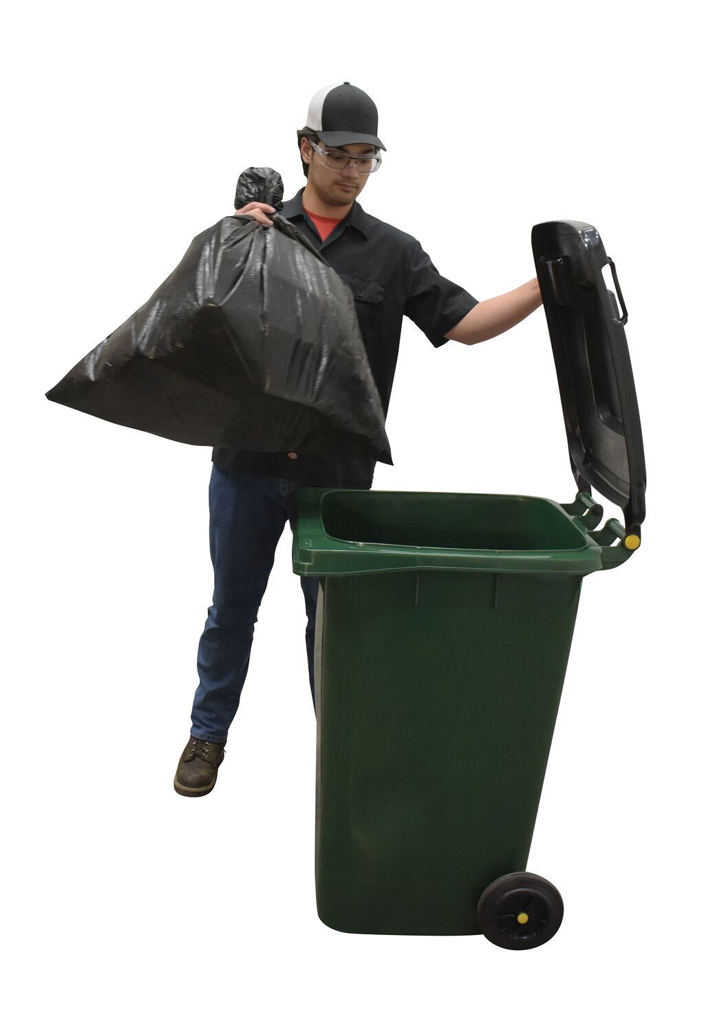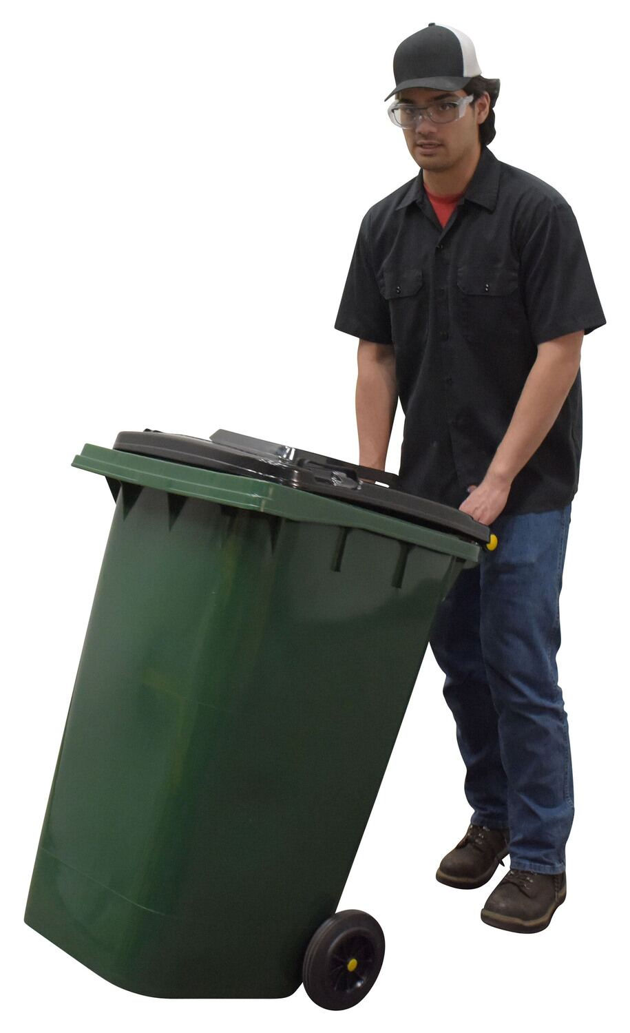 The trash can is constructed of durable polyethylene that withstands subzero cold and extreme summer heat. Great for high traffic areas such as: warehouses, fairs, ball parks, schools, etc. Each container includes two (2) wheels for easy portability and hinged lips to keep the rain out. Keep your waste out of eyesight in our heavy-duty and easy to move refuse containers.