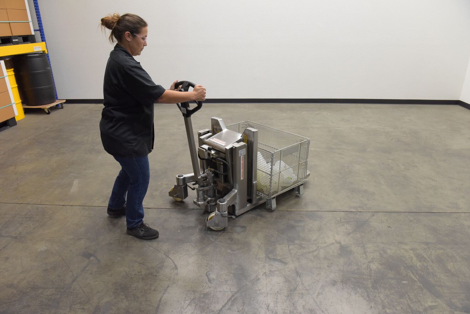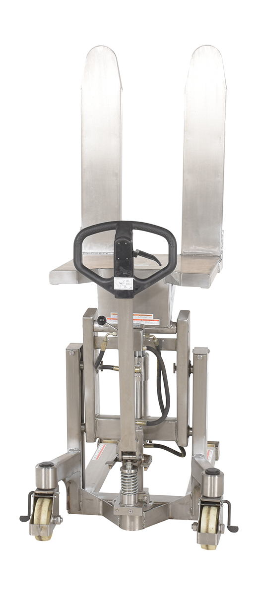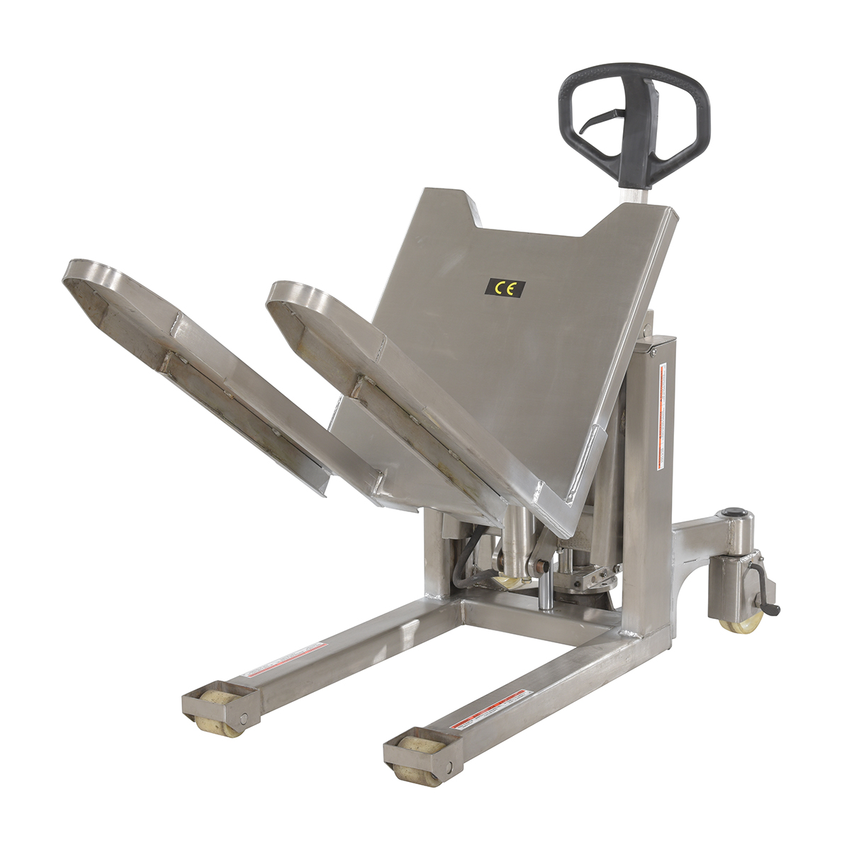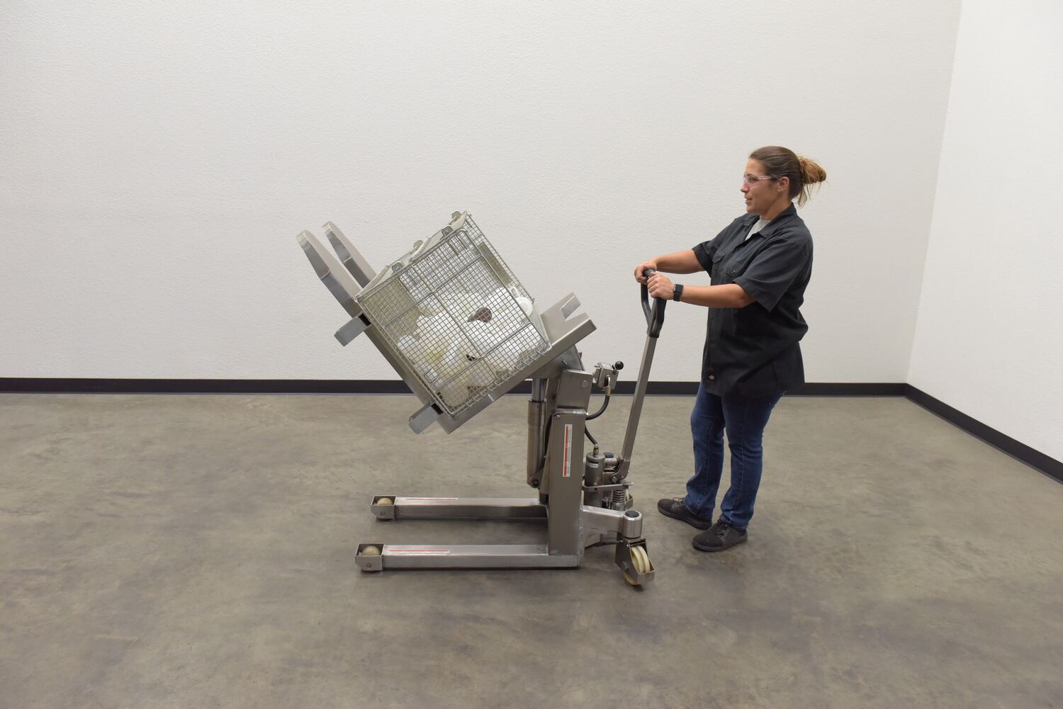 Stainless Steel Tilt Master Manual 2,200 Lb. Capacity SilverThe manual tilt master is great in a variety of settings. Whether it's lifting, tilting, or just transporting; this design is the one for the job. This unit is perfectly manufactured to help maneuver crates, boxes, or pallets with an open bottom. It also provides the user with an ergonomically correct position to reach loads easily without the need for bending down or excessively reaching over. The lift rolls smoothly on a polyurethane swivel caster with brake and foot protectors. The stainless steel construction provides strength and durability throughout a lifetime of daily use.
