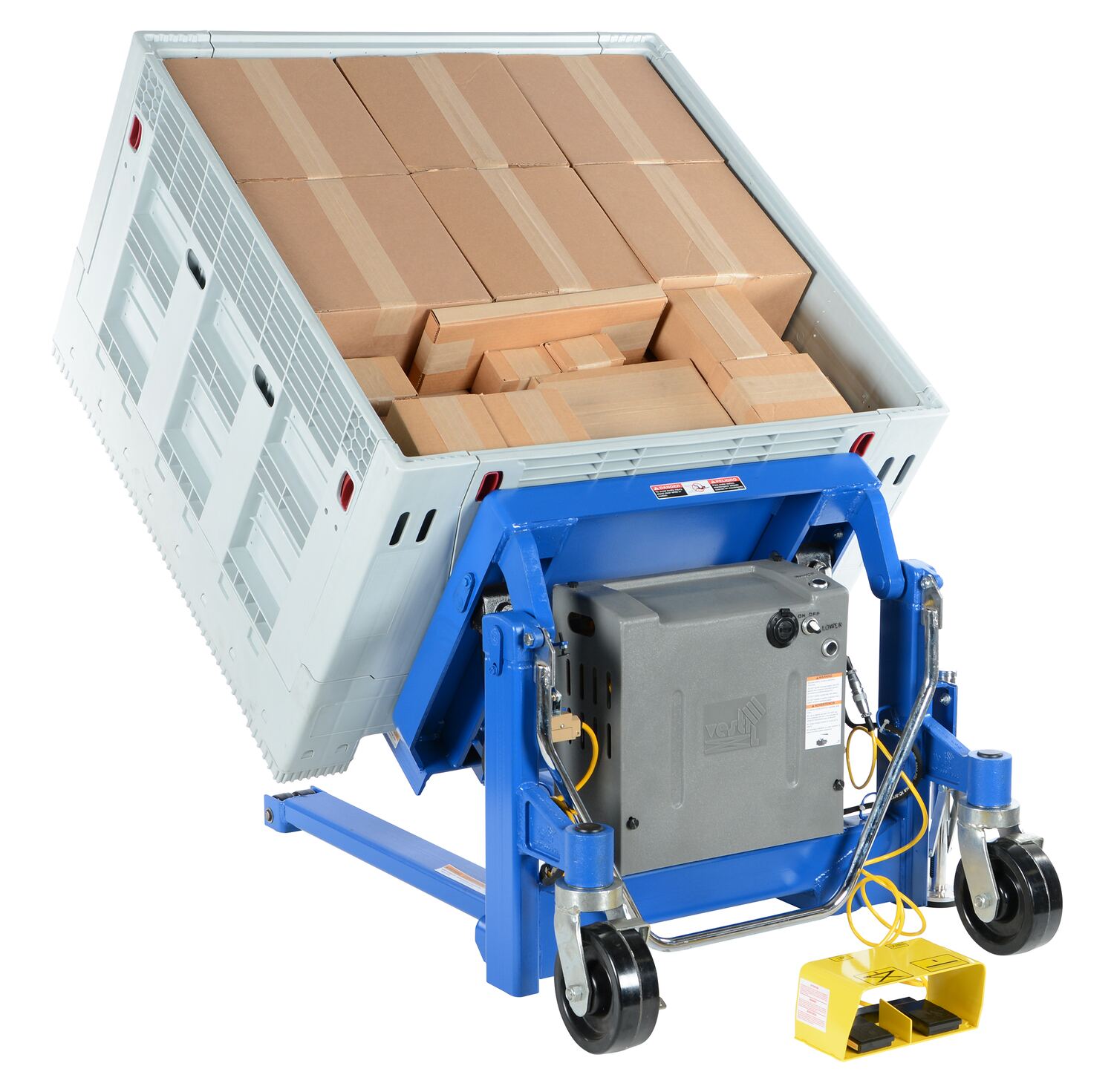 The tilt master lifts and positions filled tote boxes or baskets without the need of a fork truck or lift table using the newly designed heavy-duty tilt master. The tilter will function as transporters by moving completed products from work station to work station without waiting for a fork truck. This lift has a thin profile to allow the user to get as close to the load as possible. It also has a standard floor lock and rolls easily on the phenolic steering wheels. Lift is designed to be used with open bottom pallets or skids. The unit is powered by a DC electric motor that includes an on-board battery charger, battery charge indicator gauge and foot control.
