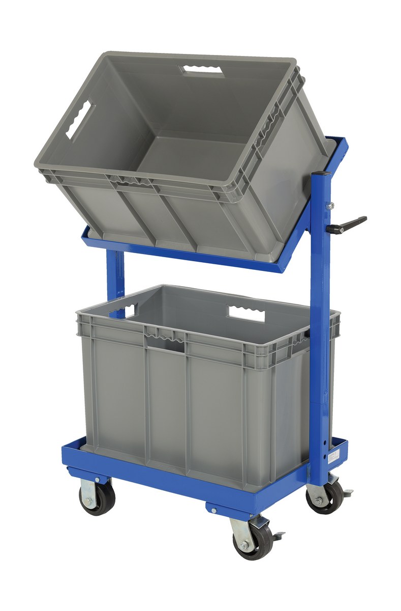 Steel Multi-Tier Cart with 2 Shelves and 2 Baskets 200 Lb. Static Capacity BlueThis unique multi-tier stock cart makes it easy to organize and reach parts. Tilting shelf allows easy access to baskets. Ideal for stocking parts in work stations. Casters allow the parts to be moved to wherever they are needed. Shelf angle is locked with a single handle design easier on the hands and allows user to apply more torque for a tight grip, handle is also "indexable" allowing for operation similar to a ratchet. Shelves include a lip on all four sides. The vertical uprights knock-down for more convenient shipping and storage. Overall cart size does not include baskets. Rolls smoothly on casters. Steel construction with a powder coat finish. Baskets included.
