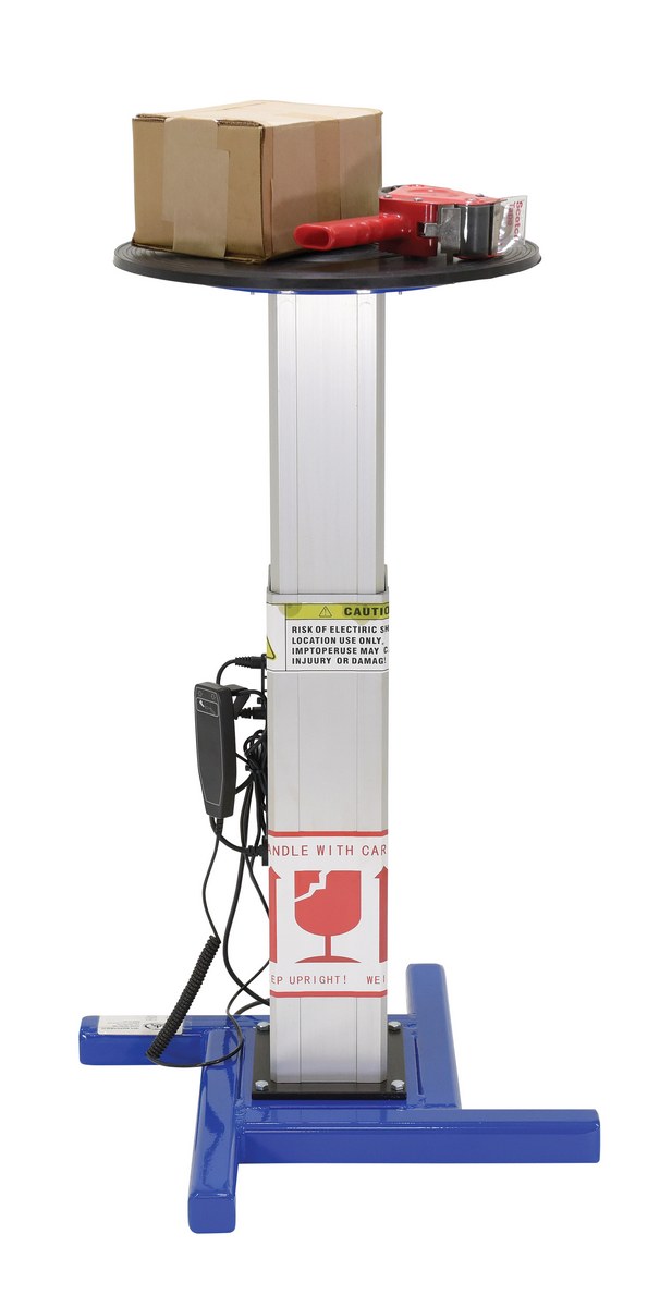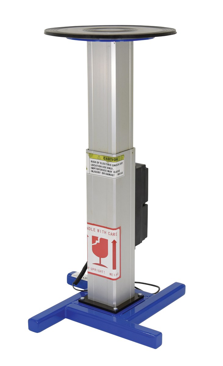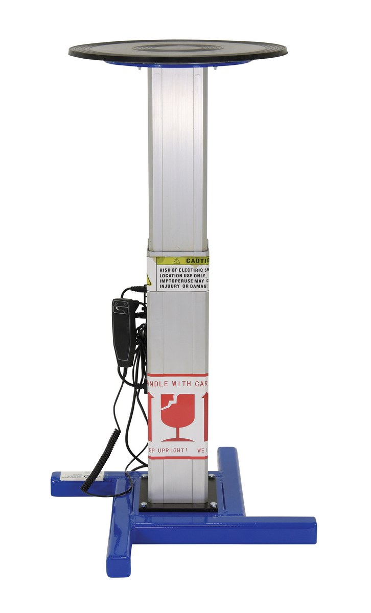 The turntable with powered height adjustment allows the operator to raise or lower turntable to an ergonomic height. This unit has a manual turntable and is DC powered with hand control for height adjustment. Hand held pendant control connects to power unit with a coil cord. Height is adjusted with an electric linear-actuator.