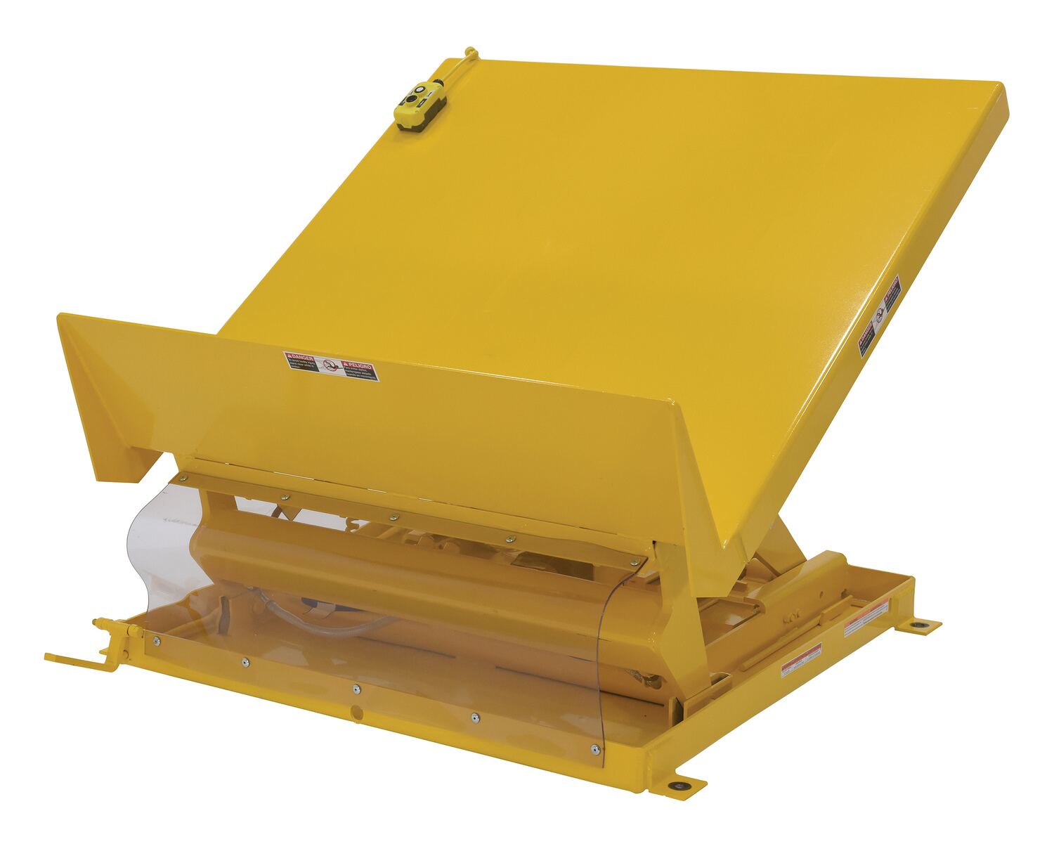 The single scissor lift & tilt table is designed to position containers within easy reach of assembly line workers and machine operators. The unique design reduces fatigue by minimizing repetitive bending and stretching required to obtain components from containers. This scissor table comes with a high lip on the tilt side which makes it ideal for parts transfer and assembly. The selector pedal allows the operator to lift while tilting, or tilt then lift. The motor is totally enclosed standard with optional voltages available. Other standard features include: a two-button handheld control, integrated maintenance lock, pressure plated pump, pressure compensated flow valve, lowering valve, independent oil return, and an adjustable upward travel switch. Scissor table must be lagged to the floor.