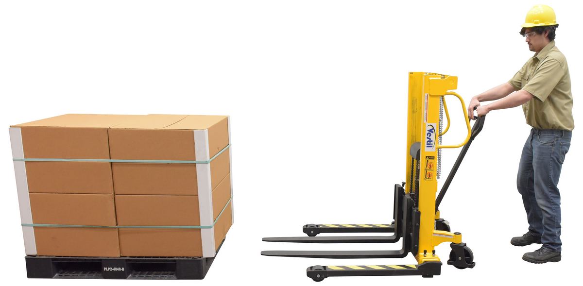 Manual Hydraulic hand pump stackers are sturdy and compact to fit through standard height doors. Forks are raised by manual hydraulic hand pump operation and released by a lever situated on the handle. 1" lift per handle pump. Two rigid and two swivel wheels standard.