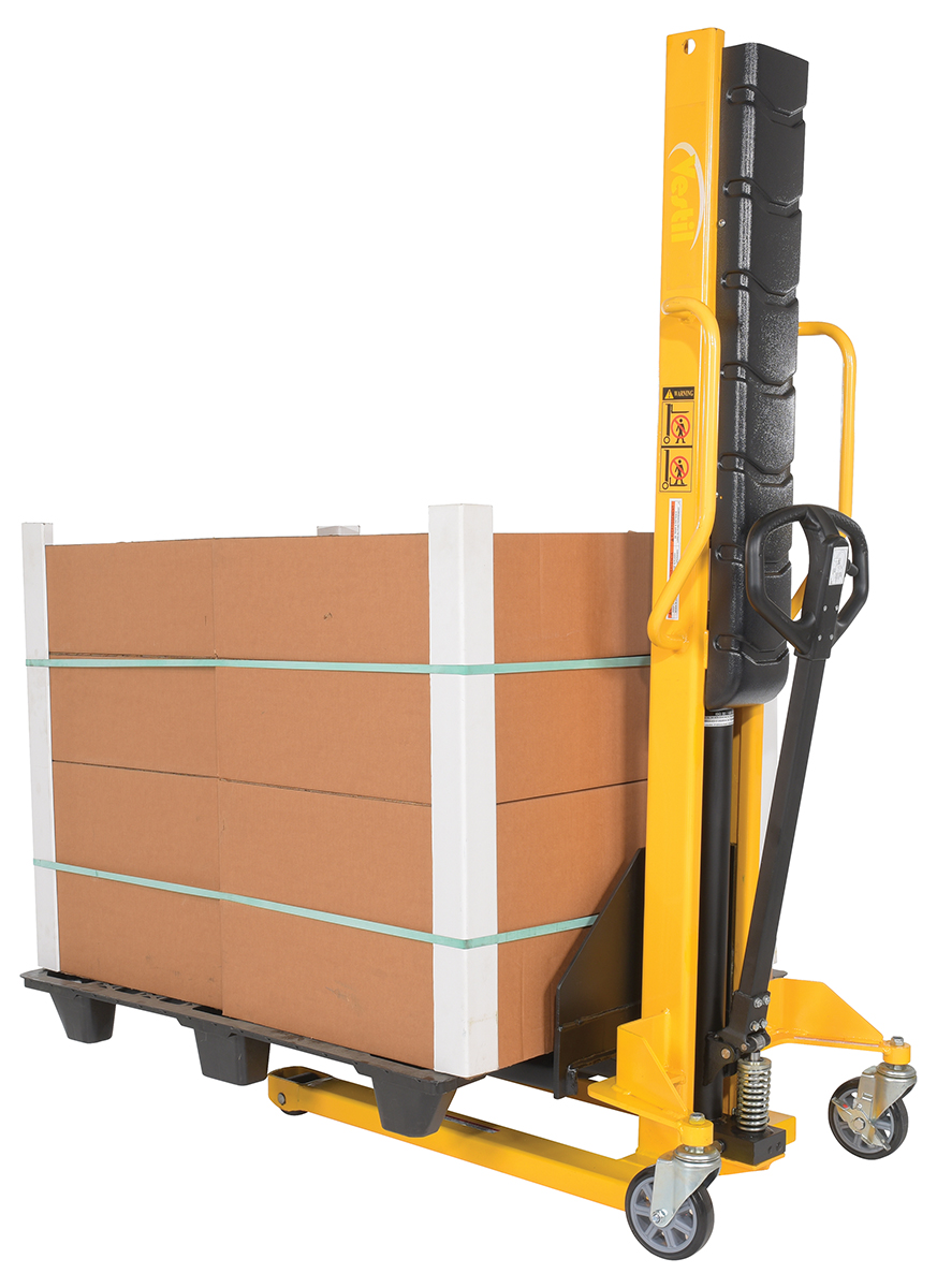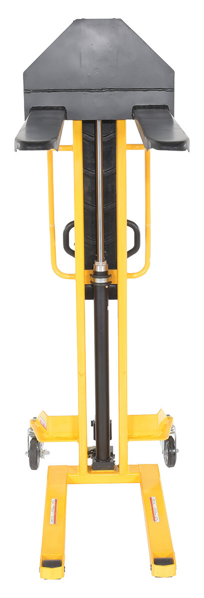Sturdy and compact to fit through standard doors. Forks are raised by manual hydraulic hand pump operation and released by a lever situated on the handle. 1" lift per handle pump. Two rigid and two swivel wheels standard.