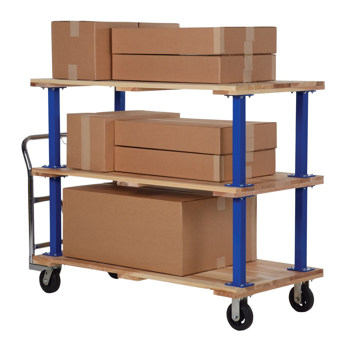 Minimize lifting and bending with this triple decker Hardwood platform cart/portable work bench. Ideal for shipping areas, offices, and plant use, this economical cart is perfect for many of your applications. Countersunk holes allow for a smooth deck surface.