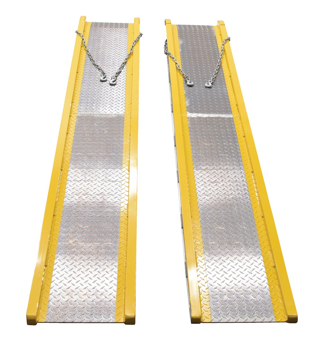 Vehicle ramps are designed to provide a safe means for driving vans, pickup trucks and passenger vehicles between ground level and elevated building entrances. These vehicle ramps include chains and hooks to firmly secure them to loading docks. Ensure that vehicles possess the ground clearance necessary to ascend or descend the ramp. Each ramp is able to accommodate wheels that are 14" wide or smaller. These robust aluminum ramps are sold in pairs.