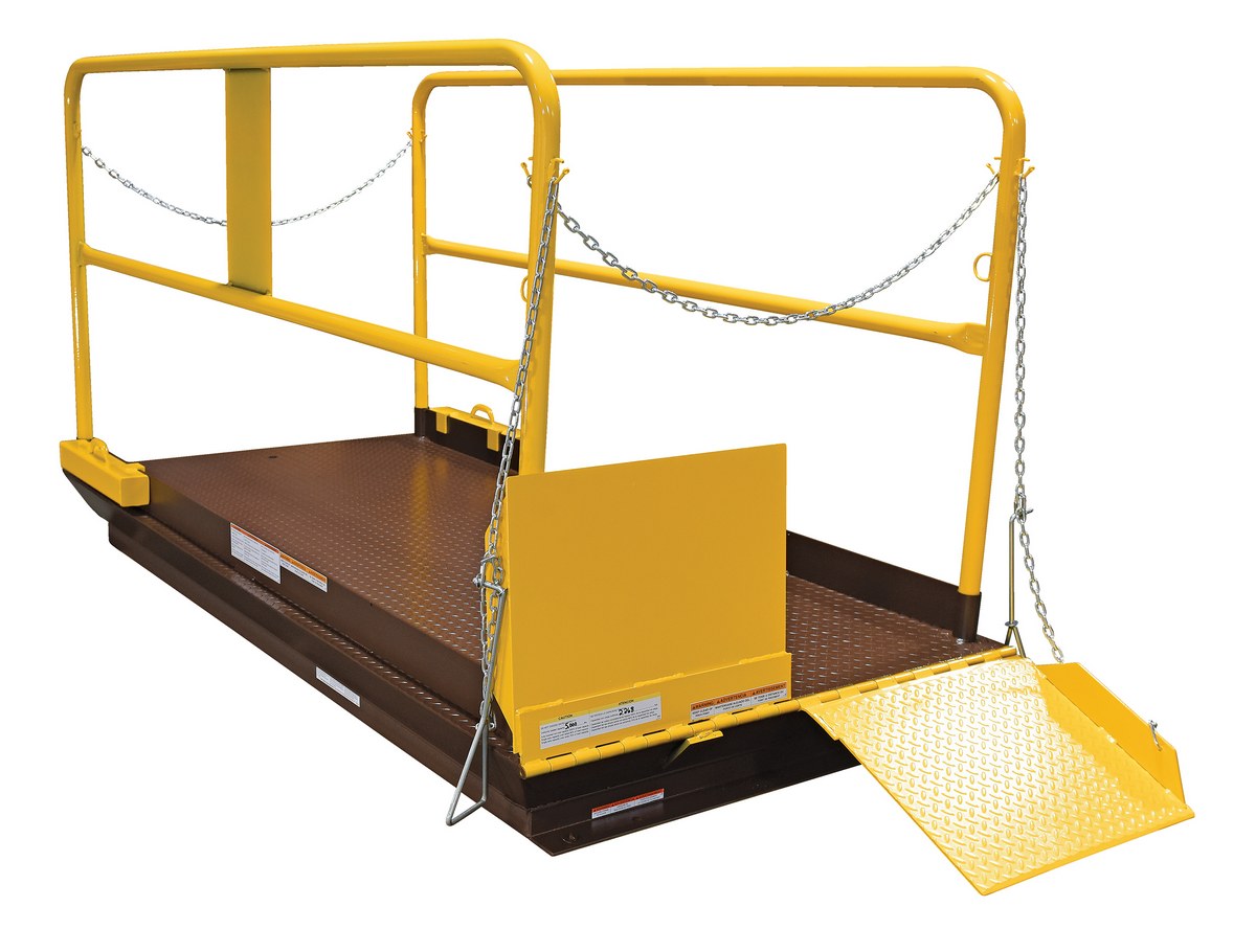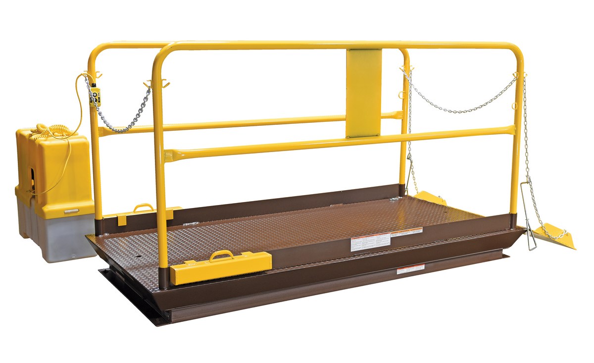 Save time and reduce man-hours where there are no docks with a truck scissor dock lift. Engineered and designed for maximum safety and efficiency. The diamond plate deck is made of heavy gauge steel for years of use. Hydraulic cylinders feature safety velocity fuse if line breaks. It comes complete with upper travel limit switch and overload relief valve. The push-button control is on a long coil cord. Pre-wired control box includes magnetic starter and overload fuse. High visibility safety yellow removable handrails with fixed toe boards are standard. Includes beveled toe-guards and electric toe-guards around perimeter of platform. The external motor can be located up to eight (8) feet away from lift.