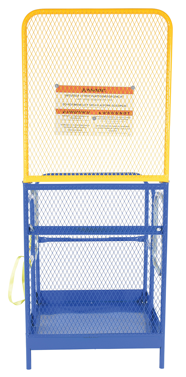 This convenient fork truck work platform quickly and safely raises maintenance personnel where they are needed. Attaches to fork truck by inserting forks into fork pockets and securing platform to fork truck. Fork locks secure platform to forks. Dual handrails on three (3) sides with expanded metal backing on the fourth side. Includes checker floor plate platform and long strap with hook to attach platform to fork truck. A maximum of two (2) people can be in the work platform at one time.