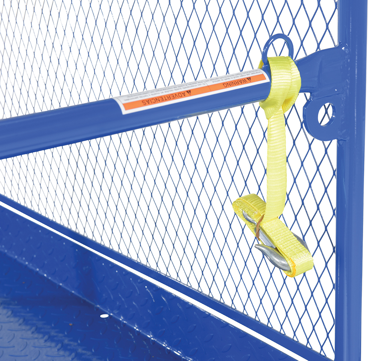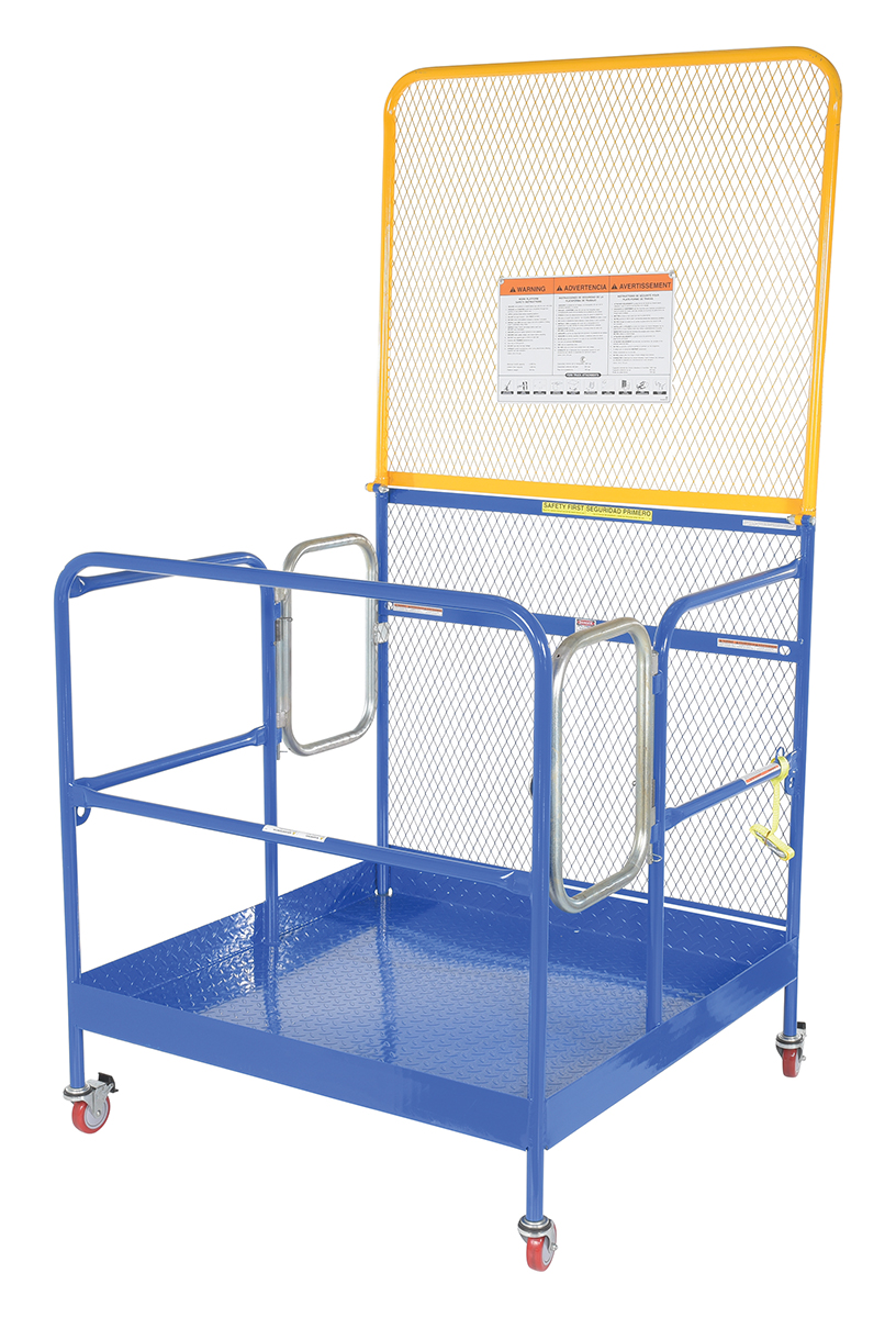 This convenient fork truck work platform quickly and safely raises maintenance personnel where they are needed. Attaches to fork truck by inserting forks into fork pockets and securing platform to fork truck. Fork locks secure platform to forks. Expanded metal backing on fourth side. Includes checker floor plate platform and long strap with hook to attach platform to fork truck. A maximum of two (2) people can be in the work platform at one time. Meets California OSHA specifications.