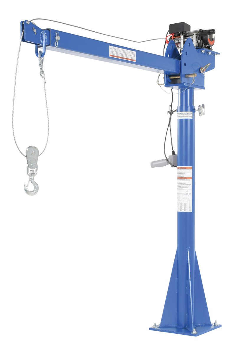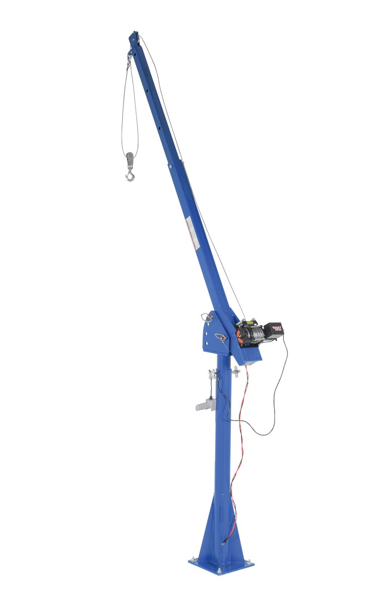 Steel DC Powered Jib Crane 4-7 Ft. Boom 2,000 Lb. Capacity BlueA power lift Jib crane is designed for material handling applications on docks, in warehouses or in truck beds. This intermittent unit uses crane feature rotation hand brakes that offer unlimited positioning. The mast mounts permanently. Boom adjusts in one (1) foot increments and can be positioned at four (4) elevations. Folds for storage. Unit is designed for vertical lifting only. Do not use unit for lifting personnel or overhead lifting.